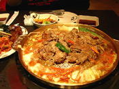 门脸“只是一扇拉门”,进去后“地方还是蛮大的”。一水的“深色”的“木桌木凳”,“柔和”的灯光,“氛围很好”。韩式料理除了...